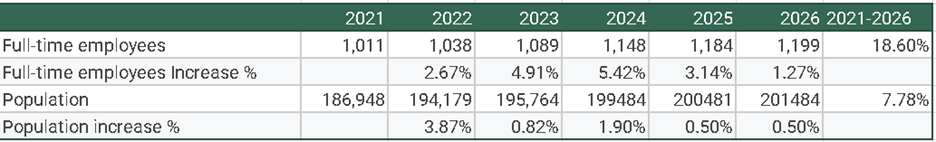 Using information provided by the city and conservative population growth estimates for 2025 and 2026, we can see that the number of full-time employees is growing at a rate more than twice that of the population growth.