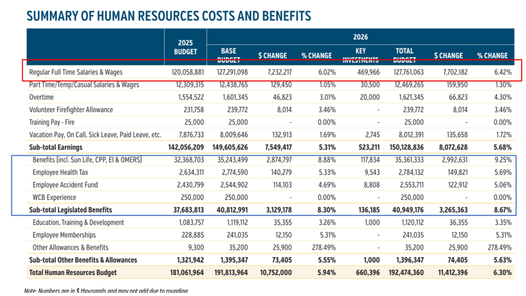 “The Human Resources (HR) costs outlined in the budget reflect costs beyond salary adjustments. In addition to base wage increases, HR expenses include mandatory payroll taxes, pension contributions, employee benefits such as health and dental coverage, and other compensation-related costs. In recent years, benefit premiums have risen far beyond standard CPI. As a result, even modest wage increases can translate into a higher overall percentage increase in total HR costs. A breakdown of drivers behind the human resource increase can be found on page 43 of the budget book “