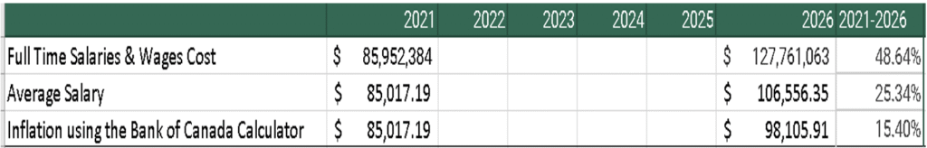 The 2021 approved budget book shows us that full-time employee salaries and wages cost $85,952,384 in 2021 (Page 410). If the average salary for a City of Burlington employee had kept pace with inflation, the average salary would be up 15.40% instead of the actual 25.34% increase.