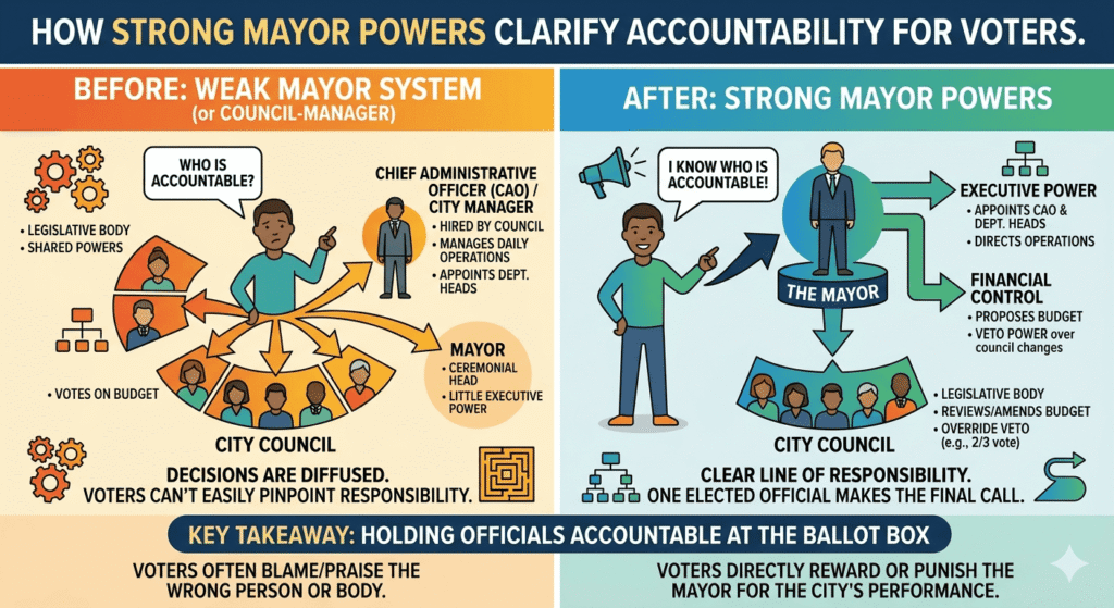 In our opinion strong mayor powers clarify accountability: